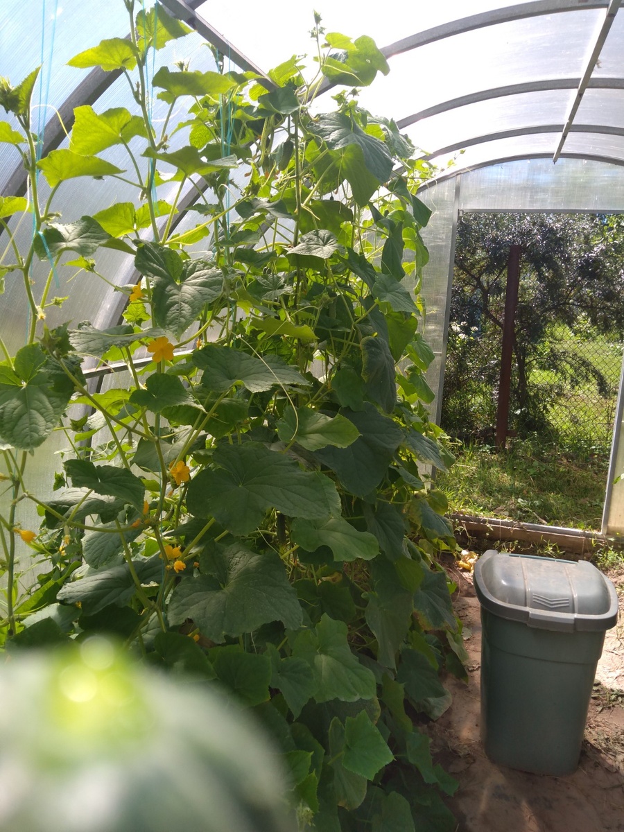 Герман F1 - 99,9% партенокарпия, женский тип цветения и гетерозис. Из недостатков- средние вкусовые качества и плотная шкура. Но идеальны в консервации. Так растения выглядели в начале плодоношения.