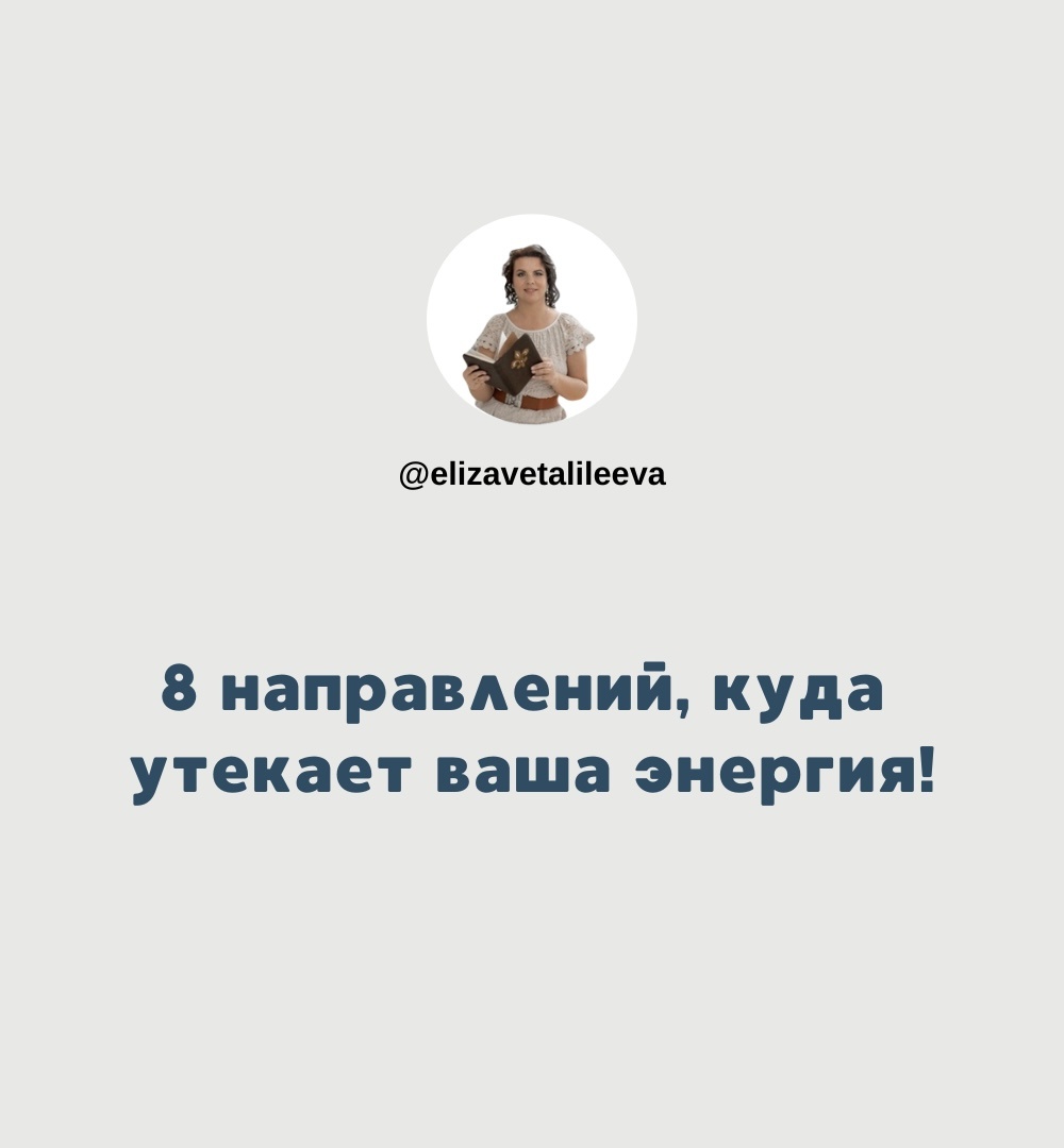 8 направлений, куда утекает ваша энергия: 1. Незаконченные, не доведенные до конца дела. Всякий раз, когда вы беретесь за какое-то дело, начинаете что-то, но не доделываете - вы теряете ресурсы. К этому относится: дать обещание и не выполнить, взять в долг, начать дело и бросить, взять на себя дел сверх силы. Как не терять эту энергию? Или доделывать или на очень глубоких уровнях своего бессознательного проработать этот мезанизм слива энергии и перестать загоняться ,если вы что-то имеете привычку не доделывать ✔️ 2. Ложь другим и самому себе. Когда человек лжет, его ментал создает энергонасыщенных информационные пространства, наполненные энергией придуманного сценария. Чем больше врете - тем их больше, тем больше энергии вы начинаете в них отправлять постоянно. Также происходят блокировки по таким энергоцентам как: голова, горло, сердце, солнечное сплетение и малый таз. Там могут появляться как просто блокировки, так и более сложные негативы и даже договоры с сущностями. В иде