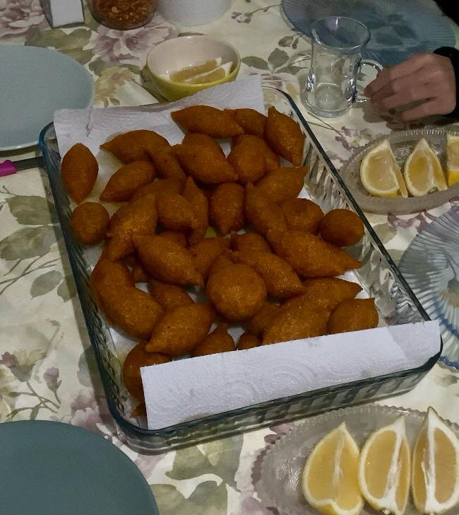 Так вот в этом самом месте мы всегда едим одно и то же - это мясной донер и ичли кефте. Салат, картофель фри, хлеб и соус типа аджики приходит бонусом. Я как-то в разговоре упомянула об этом турецкой маме и она предложила в один выходной налепить ичли кефте самим и заморозить, а как захочется пожарить в масле за 2 минуты. И вот этот выходной был вчера, купили фарш, прочие ингредиенты и поехали к родителям. Причем мама настояла, чтоб мы приехали с самого утра на завтрак и провели весь день вместе. Ну так и сделали.