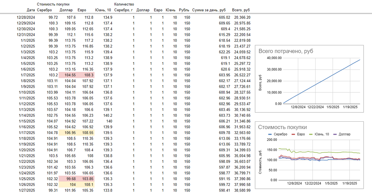 Что ж, настала пора показывать новую монетку. Ежедневный эксперимент пережил и новогодние праздники, и отпуск, и возвращение на работу. Да и бумаг в инвестиционном портфеле прибавилось. Показываю, что получилось. Общая таблица сейчас выглядит так: Можно заметить, что при покупке доллара и евро я перескакивала между 2 банками. Потому что в желтом в начале января с курсами творилась какая-то полная беда и спред от красного отличался аж на 10 рублей. Я продолжала покупать в надежде, что это скоро изменится, написала в поддержку с вопросом и подождала открытия биржи. Но и после открытия валюта продавалась по 113 рублей вместо 105, и я ушла на счет в банк красный.) Вернулась, когда ситуация более-менее стабилизировалась, уже во второй половине января. Теперь эти валюты суммируются у меня на двух счетах. Итого: 63 доллара и 63 евро Сегодня мне захотелось картиночек, поэтому еще раз полюбуемся на 1 доллар с пирамидой и посмотрим на оборот купюры в 1 доллара с 3 президентом. Именно из-за обо