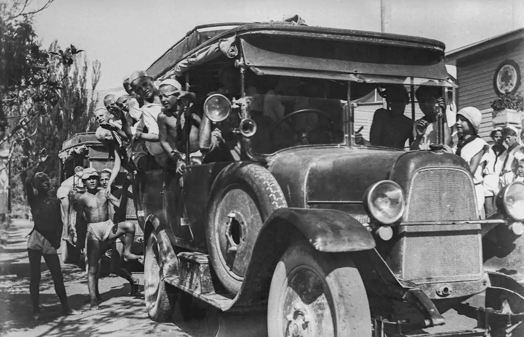 На фотографии мы видим приезд новой группы школьников в пионерский лагерь «Артек», точная дата снимка не известна, автор указывает, что это где-то конец 1920 годов, начало 1930-х. Автор: Я. Е. Берлин.
