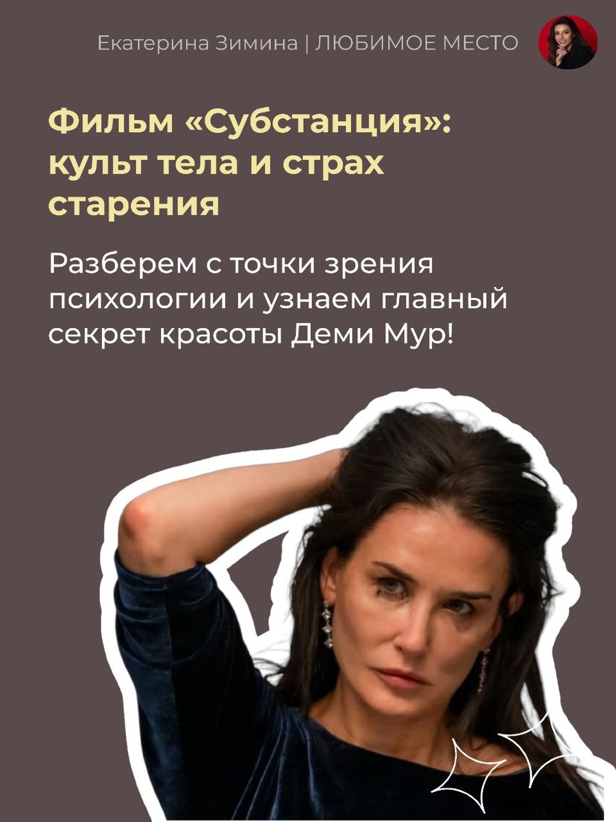 «Субстанция» — один из самых высокооцененных фильмов года. В главных ролях Деми Мур – сногшибательная звезда Голливуда. Немного о сюжете — лучшие дни актрисы Элизабет Спаркл давно позади. Ей больше не предлагают ролей в кино, а единственным источником заработка остается ведение утреннего фитнес-шоу. Но и оттуда её увольняют — как выясняется, из-за возраста. Элизабет впадает в отчаяние и не понимает, что делать. Однажды актрисе предлагают поучаствовать в эксперименте. Если она вколет себе зеленую жидкость «Субстанция», из ее тела появится новая она — молодая и привлекательная. И она соглашается… Главная героиня фильма страдает геронтофобией – тревожное психическое расстройство, которое связано с ненормальным страхом собственной старости. Фильм затрагивает такую важную проблему, как нездоровая гонка за красотой. Сейчас даже есть термин Toxic wellness (токсичное благополучие) — которым описывают нездоровое, маниакальное стремление к успеху, здоровью и красоте. Часто его относят к блогера