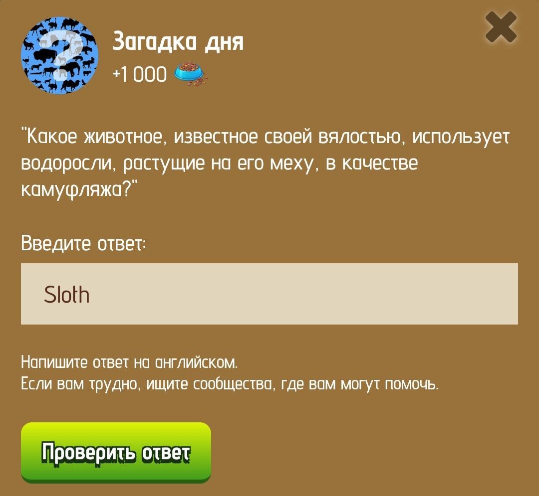 в ZOO Загадка дня: "Какое животное, известное своей вялостью, использует водоросли, растущие на его меху, в качестве камуфляжа?"