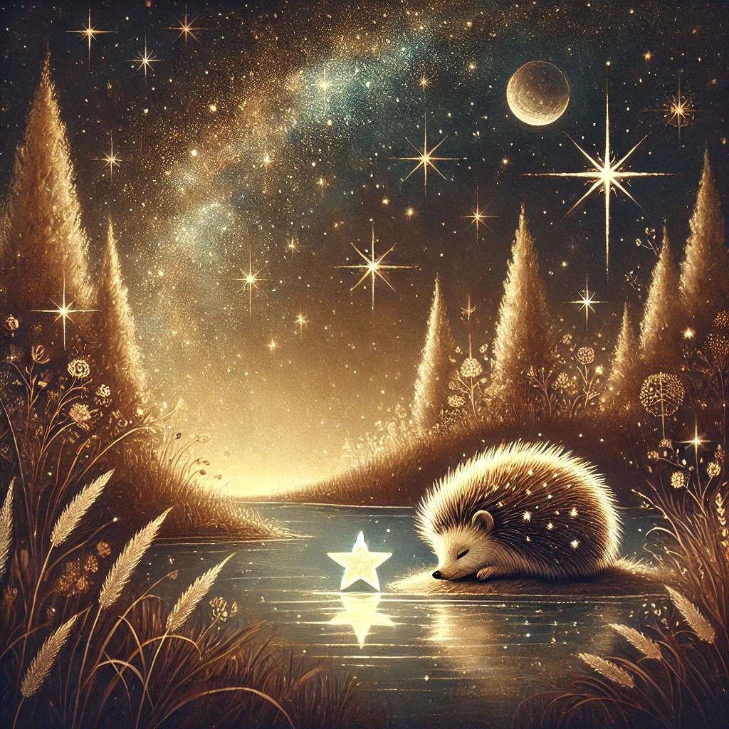 Жил-был на небе маленький Звёздный Ёжик. Его иголочки были сделаны из настоящих звёзд, которые ярко светились ночью. Каждую ночь он бегал по звёздному полю, помогая луне собирать падающие звёзды, чтобы они не потерялись в темноте. Однажды одна звезда, маленькая и совсем тусклая, упала на Землю. Звёздный Ёжик решил отправиться за ней. «Как же она там одна? Ей ведь холодно и страшно», – подумал он и скатился с неба на Землю. На Земле было совсем не так, как на небе. Здесь росли большие деревья, шелестела трава, а в ночной тишине слышался шёпот ветра. Ёжик стал искать звезду, заглядывая под кусты и в высокую траву. Наконец, он увидел её – она лежала на берегу маленького озера, грустная и тусклая. – Почему ты не светишь? – спросил Ёжик. – Мне страшно. Здесь так темно, и я потеряла свою силу, – прошептала звезда. Звёздный Ёжик задумался. Он вспомнил, как его мама-звезда говорила, что сила света кроется в тепле и доброте. Тогда он решил поделиться своим светом с упавшей звездой. Он ост
