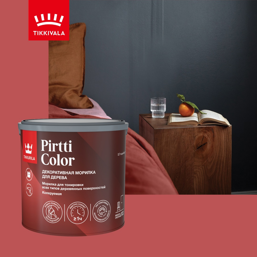 Представляем вам новую декоративную колеруемую морилку, разработанную специально для тонировки всех типов деревянных поверхностей! — Легкость в использовании. Морилка равномерно ложится, не образуя резких переходов оттенка и подтеков, подчеркивая естественную структуру древесины. — Регулируемая интенсивность цвета. Хотите получить более насыщенный оттенок? Нанесите морилку в несколько слоев! А для создания светлого тона разбавьте морилку водой в соотношении 1:1 без потери удобства нанесения. Данное свойство, в сочетании с богатой палитрой колеровки, открывает двери к воплощению любых творческих идей. — Быстрое высыхание. Tikkivala Pirtti Color быстро сохнет, не имеет резкого запаха и легко наносится, в том числе распылением. Для придания мореной поверхности защитных свойств используйте лаки Tikkivala: для мебели — Tikkivala Kiva Decor, для пола — Tikkivala Unica Super Strong, для стен — Tikkivala Paneeli-Assa Expert. — Универсальность. Морилка может использоваться для стен, потолков, п