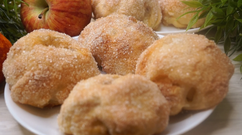Берем одну часть, раскатываем круг заворачиваем половинку яблока. Смазываем яйцом, и обваливаем в сахаре верхнюю часть. Кладем на противень. Ставим в разогретую духовку и выпекаем при 200 градусах 35-40 минут, до ле