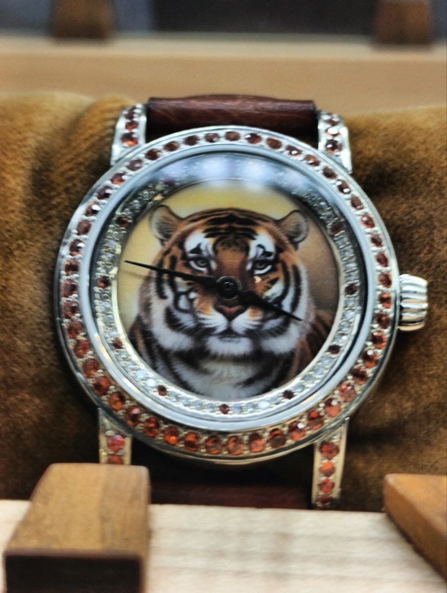 В музее времени и часов представлены часы "Тигр" компании Tsedro. Циферблат часов изготовлен методом горячей эмали (25 слоёв!!!). Изготовление циферблата методом горячей эмали Создание циферблата с помощью горячей эмали — это самый сложный, трудоемкий и, как следствие, самый дорогой процесс среди всех методов эмалирования. Циферблат, являющийся «лицом» часов, служит для отображения времени, и в мире часового искусства существует множество способов его изготовления. Однако метод горячей эмали, который насчитывает многовековую историю, по праву считается одним из самых древних и престижных. Этот процесс требует высокой точности, мастерства и терпения, но результат всегда восхищает своей красотой и долговечностью. История метода Горячая эмаль, известная также как роспись, имеет многовековую историю. Первые упоминания о ней относятся к Древнему Египту, где её использовали для украшения ювелирных изделий и ритуальных предметов. Позже этот метод стал популярным в Византии, Европе и России. Ч