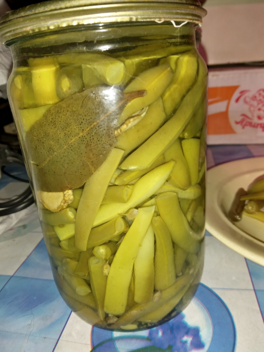 Сначала осенью просто хотела засолить избыток спаржевой фасоли, потом отмачивать и готовить. Да, ее выращиваем очень много. Потом не удержалась и "взялась за старое"- сначала выдумать рецепт, потом сделать, закатать и пробовать зимой. Пришел черед извлекать запасы и дегустировать. Вышло совсем неплохо и съедается это быстро. Молодую спаржевую фасоль собираем (естественно) в фазе молочной спелости когда стручки легко ломаются в руках. Помыла, нарезала. Отварила в кастрюле без добавления соли до мягкости около10 минут (небольшой хрустик даже приветствуется). Слила воду с фасоли. В банки положила ЗВЕЗДОЧКУ БАДЬЯНА, ЛАВРОВЫЙ ЛИСТ, НЕСКОЛЬКО ГОРОШИН ДУШИСТОГО ПЕРЦА, ЛОМТИК ИМБИРЯ, ЧАЙНУЮ ЛОЖКУ ПАЖИТНИКА ГОЛУБОГО. На специи сложила отваренную фасоль НЕ ОЧЕНЬ ПЛОТНО, без утрамбовывания по плечики банки. Потом насыпаем и наливаем На банку 700 мл : 2 чайных ложек сахара 1,5 чайных ложек соли 4 чайных ложки яблочного уксуса 1 столовую ложку растительного масла Это слабенький маринад!!! Можно бо