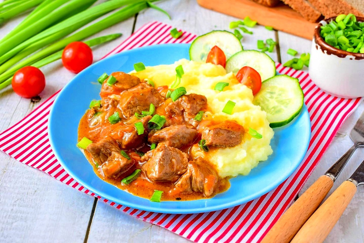 Гуляш из говядины в казане Этот рецепт в точности повторяет распространённый в СССР рецепт гуляша. Приготовив мясо по этому классическому рецепту, вы получите хорошо знакомый каждому жителю СССР гуляш из говядины с томатной подливкой. В качестве гарнира можно подать макароны, рис, гречку. Но лучшим гарниром, на мой взгляд, будет картофельное пюре! Приятного аппетита! Продукты: Говядина – 2 кг Лук репчатый – 4 шт. Томатная паста – 200 г Вода – 2 л Мука – 4 ст. ложки Лавровый лист – 4 шт. Перец свежемолотый Соль Масло растительное Приготовление: Говядину (у меня мякоть бедра) нарезаем некрупными кубиками, размером примерно 2х2 см. Говядину для приготовления гуляша я рекомендую использовать молодую. Лук очищаем и нарезаем некрупным кубиком. В хорошо разогретом казане с растительным маслом обжариваем мясо на сильном огне, небольшими порциями (по 500 г), до румяной корочки. Извлекаем его из казана. Обжариваем лук до золотистости, также на сильном огне. Уменьшаем огонь до среднего и возвраща