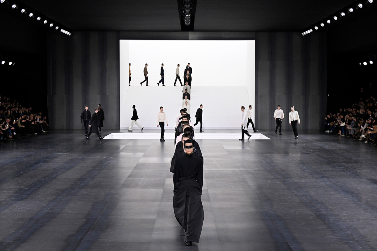 Атласная повязка на глаза в виде банта, чёрный джемпер, просторные брюки-кимоно из тафты: первый образ Кима Джонса стал концептуальным предвестником самого сдержанного исследования канонов Кристиана Диора, которое он представил в новой мужской коллекции.