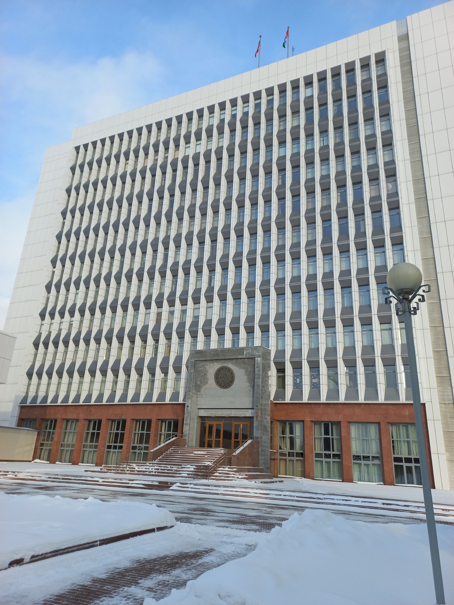 Первым в сегодняшней статье зданием является Законодательное Собрание Новосибирской области. Это довольно стильный пример позднесоветского модернизма, строившийся с 1976 по 1982 годы по проекту архитектора Пирогова. Сейчас вряд ли можно назвать данное здание выделяющимся на фоне окружающей застройки, но изначально оно предполагалась как доминанта района. К сожалению, бесконтрольная современная застройка поставила на подобном плане крест. Еще одним интересным фактом является то, что возведением здания Заксобрания занимался застройщик, ответственный за знаменитый новосибирский Академгородок, о котором у меня в планах написать отдельную статью.