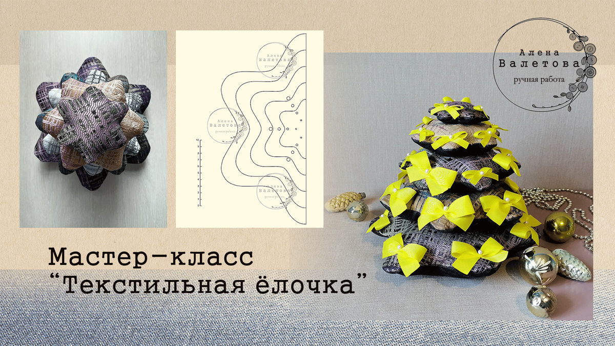 Материалы и инструменты: - Ткань двух видов. В моём случае это тёмный деним и образцы мебельных тканей одного вида, но разных расцветок. - Синтепон или холлофайбер. - Клеевой пистолет. - Нитки - Материал для декорирования ёлочки. Здесь это репсовая лента шириной 25 мм и 9 мм и бусины «под жемчуг». Как украшение можно использовать: большие красивые пуговицы настоящие маленькие ёлочные украшения вырезанные из кружевной ткани элементы небольшие фигурные деревянные заготовки (например, снежинки) ёлочные бусы, приклеенные по контуру ярусов. Распечатайте выкройку в четырёх экземплярах. Настройте параметры печати принтера для печати в реальном масштабе. ! Линейка на листе с выкройкой для проверки масштаба печати. Отрезать от двух экземпляров выкройки отмеченную жёлтым часть. Склеить выкройки попарно, наложив обрезанные листы на целые. Обрезать по внешнему контуру. Расположить выкройку на ткани. ! Если ткань новая, то перед раскроем её нужно декатировать, чтобы исключить дальнейшую усадку (мо