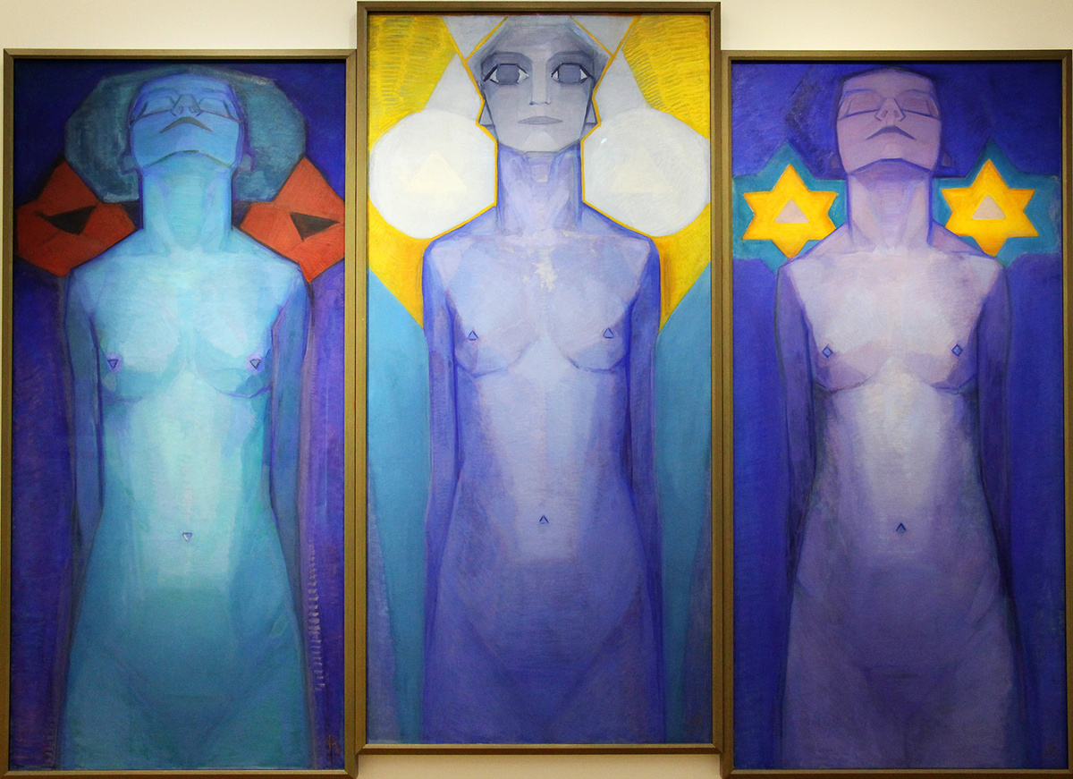 Будучи членом Теософского общества — группы, выступавшей за гармоничный мир, в котором дух и материя едины, — Пит Мондриан (1872–1944) освободил объекты на своих картинах от требований натуралистического изображения. Теперь его композиции могли включать в себя совершенной различные компоненты необходимые для общей гармонии картин — материальные элементы легко сливались с общим духовным посланием художника. Самой заметной работой этого периода стала «Эволюция» (1911) — триптих из трех стоящих человеческих фигур. Это был первый случай, когда Мондриан обратился к изображению обнаженной натуры. Картина посвящена постепенному перерождению живых форм в высшие существа. Эволюция здесь происходит из-за отказа от чувственного опыта, в результате духовного развития. Мы видим как фигуры на плечах с боковых панелей превращаются в чистый свет на центральной картине. Данный триптих был вдохновлен образами с литографий отца художника. После смерти матери Мондриан обратился к религиозным темам и