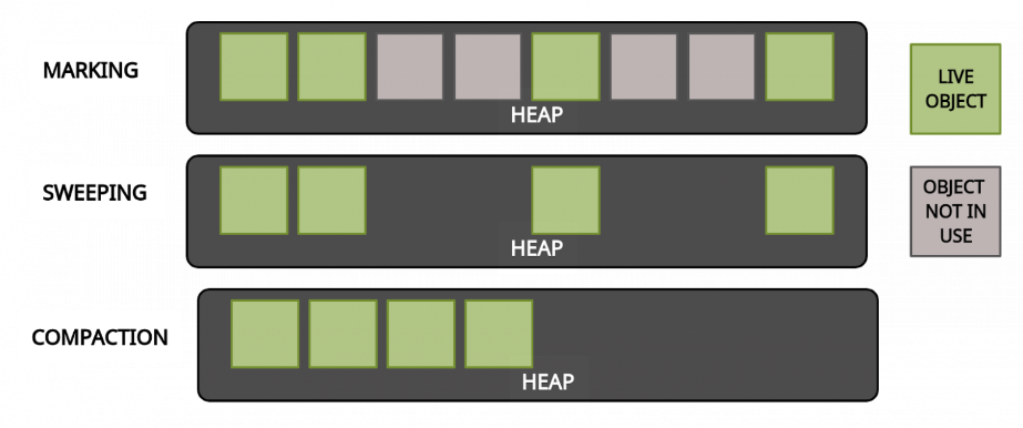 - Compact (уплотнение). Объекты, пережившие очистку, перемещаются в единый непрерывный блок памяти. Это уменьшает фрагментацию кучи и позволяет проще и быстрее размещать новые объекты.