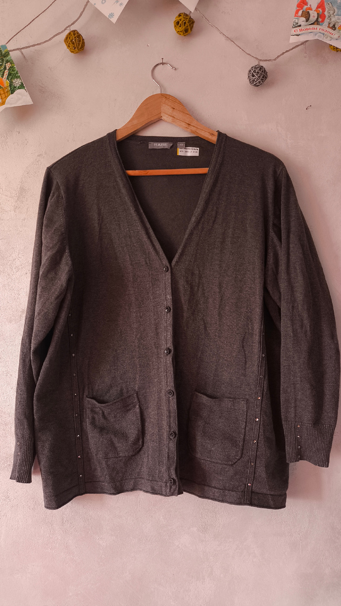 Сходила, ради интереса , в "Мегахенд" на скидку 90%. Была тут на скидке 80%. И стало очень интересно, а что же "доживёт" до скидки 90%.? Людей, как всегда на максимальной скидке , было очень много. Но мне даже удалось кое-что найти 1. С первого взгляда- какая-то невзрачная кофта серо-коричневого или коричнево-серого цвета. Можно назвать такой цвет "Капучино", наверное. 110₽ Но она очень приятная на ощупь. И мне понравился цвет. Как-то я поняла, что мне нужна кофта такого цвета, чтобы надевать её под бежевый жилет. И почти сразу купила такую кофту (кардиган) , но без пуговиц. Оказалось, что кофта без пуговиц- это неудобно... И я, стара носить ту кофту дома, когда прохладно. И вот мне попался кардиган цвета "капучино" с пуговицами. Ещё на этом кардигане есть стразы Когда я дома примерила эту вещь, оказалось, что смотрится она очень круто!! Я была удивлена))) Постираю кардиган и потом сфоткаю на себе. А ещё оказалось, что кардиган этот недешевого немецкого бренда RAVE. Кар