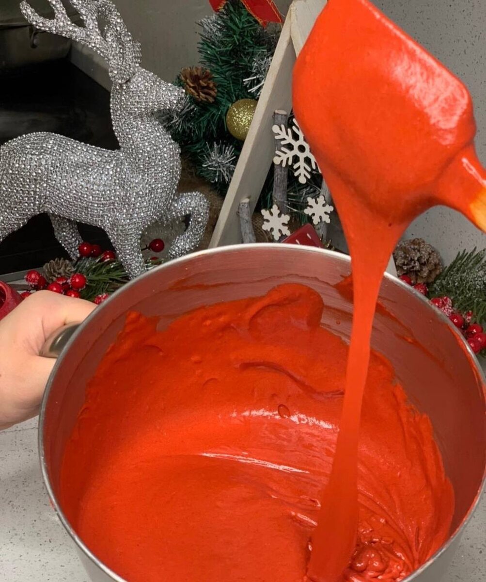 Видео рецепт по ссылке Для Бисквита "Красный Бархат" Мука - 350 гр Сода - 1 ч.л. (6 гр) Разрыхлитель - 2 ч.л. (8 гр) Соль - 1/2 ч.л. Какао порошок - 14 гр (2 ст.л.) Масло сливочное - 100 гр Сахар - 300 гр Масло растительное - 100 мл Яйцо - 3 шт Кефир - 300 мл Краситель красный - 3 ч.л. Крем для прослойки Сливки 33-35% - 500 мл Сахарная пудра в сливки - 150 гр Сыр маскарпоне - 700 гр Крем-чиз на сливочном масле для выравнивания Сливочное масло - 500 гр Сливочный сыр - 800 гр Сахарная пудра - 300 гр Краситель гелевый - 2/3 ч.л. Шоколадные подтёки Шоколад белый - 60 гр Масло растительное - 10 гр (2 ч.л.) Декор У меня снежинки , кокосовая стружка, посыпка, маршмело и шоколадки «Рафаэло». Приготовления Кекс: Сливочное масло взбиваем до белой пышной массы и добавляем сахар мешаем , и добавляем растительное масло Муку, какао, соль , разрыхлите и соду соединяем. Просеиваем через сито. К кефиру добавляем краситель . К нашей массе из масел и сахара, добавляем по одному яйцу и ванильный сахар взб