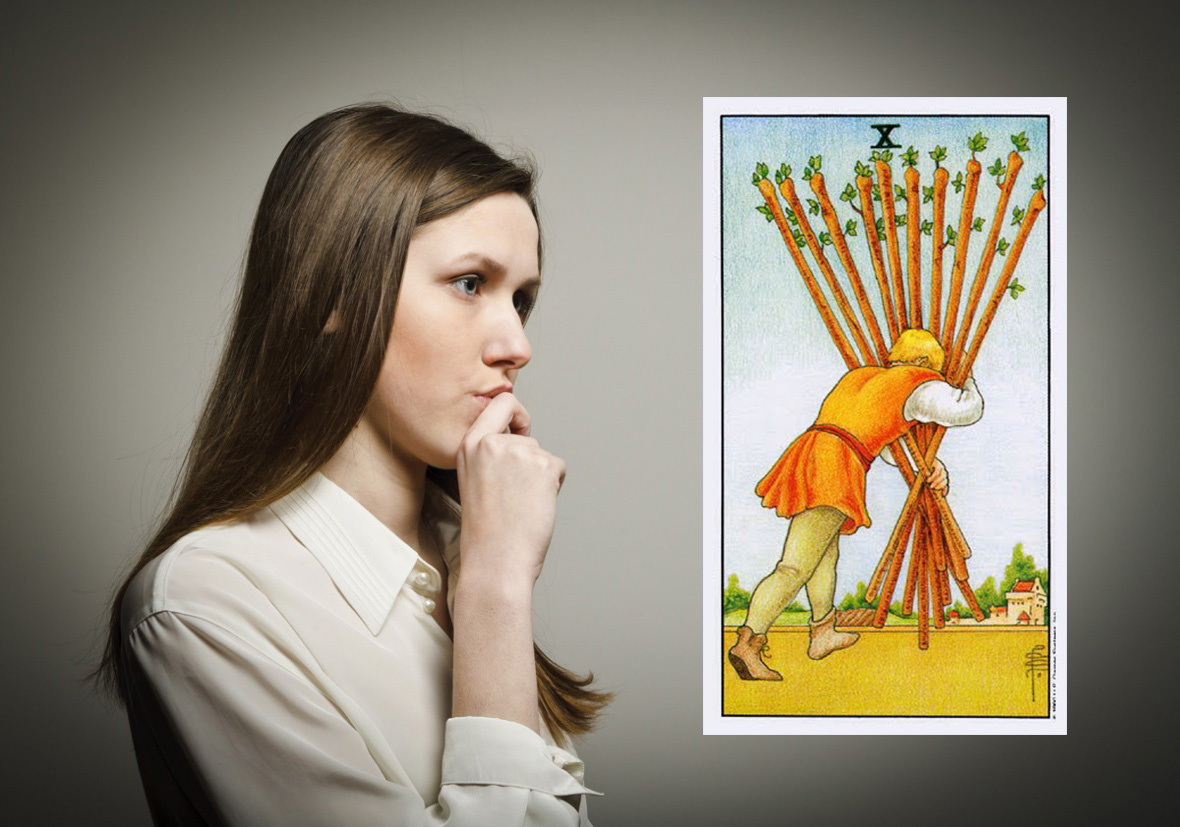 На карте Таро Уэйта мы видим человека, согнувшегося под тяжестью десяти жезлов. Он настолько загружен, что даже не видит дороги перед собой. Вся его жизнь – это его ноша, его обязанности, его ответственность. Узнаёте себя?