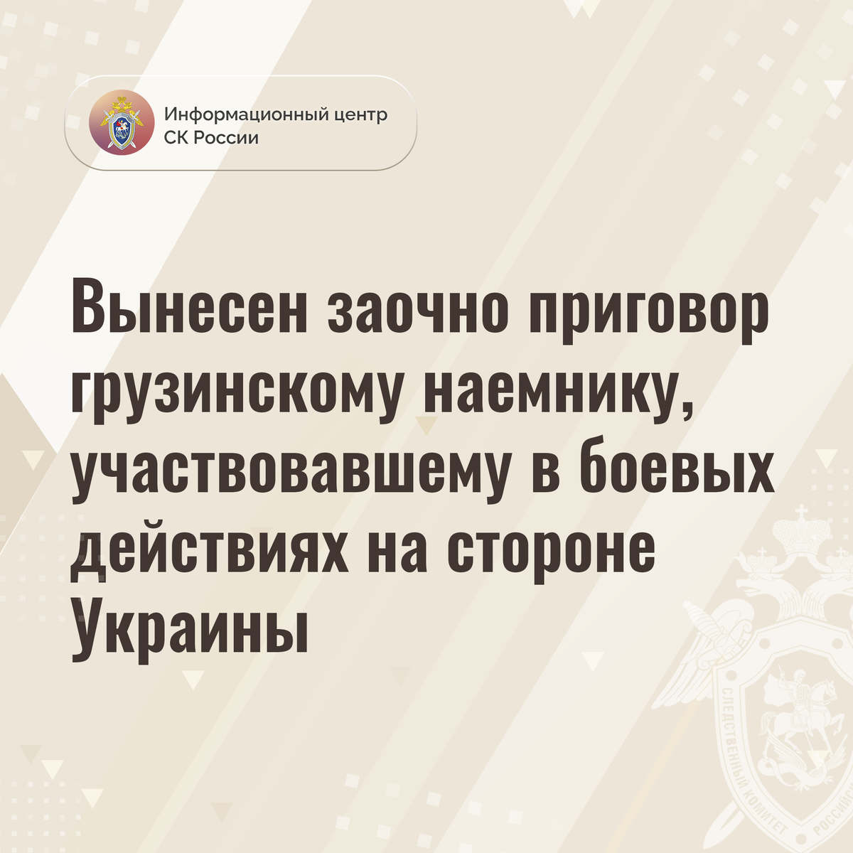 Доказательства, собранные Главным следственным управлением Следственного комитета Российской Федерации, признаны судом достаточными для вынесения приговора (заочно) гражданину Грузии Рамази Жангидзе. Он признан виновным в совершении преступления, предусмотренного ч. 3 ст. 359 УК РФ (участие наёмника в вооруженном конфликте).