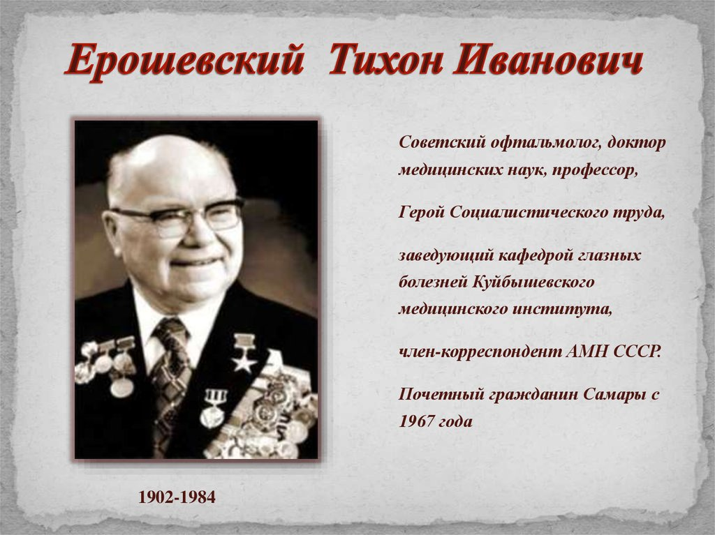 Академик Академии медицинских наук СССР, профессор, доктор медицинских наук, заведующий кафедрой глазных болезней Куйбышевского государственного медицинского университета, основатель знаменитой самарской офтальмологической школы. Автор: По материалам администрации городского округа Самара Научная деятельность Тихона Ивановича Ерошевского началась сразу после окончания университета: его назначают директором областного офтальмологического института в Саратове. В 1939 году Ерошевского направляют на работу в Сталинград, где он организует и возглавляет кафедру глазных болезней. С началом Великой Отечественной войны Тихон Ерошевский работал постоянным консультантом управления эвакуационных госпиталей в Сталинграде. С 1942 по 1943 годы работал начальником эвакуационного госпиталя в Сызрани. В 1943 году вернулся в Сталинград для восстановления медицинского института, где заведовал кафедрой и работал заместителем директора по научной работе. В 1949 году Ерошевский становится директором Куйбыше