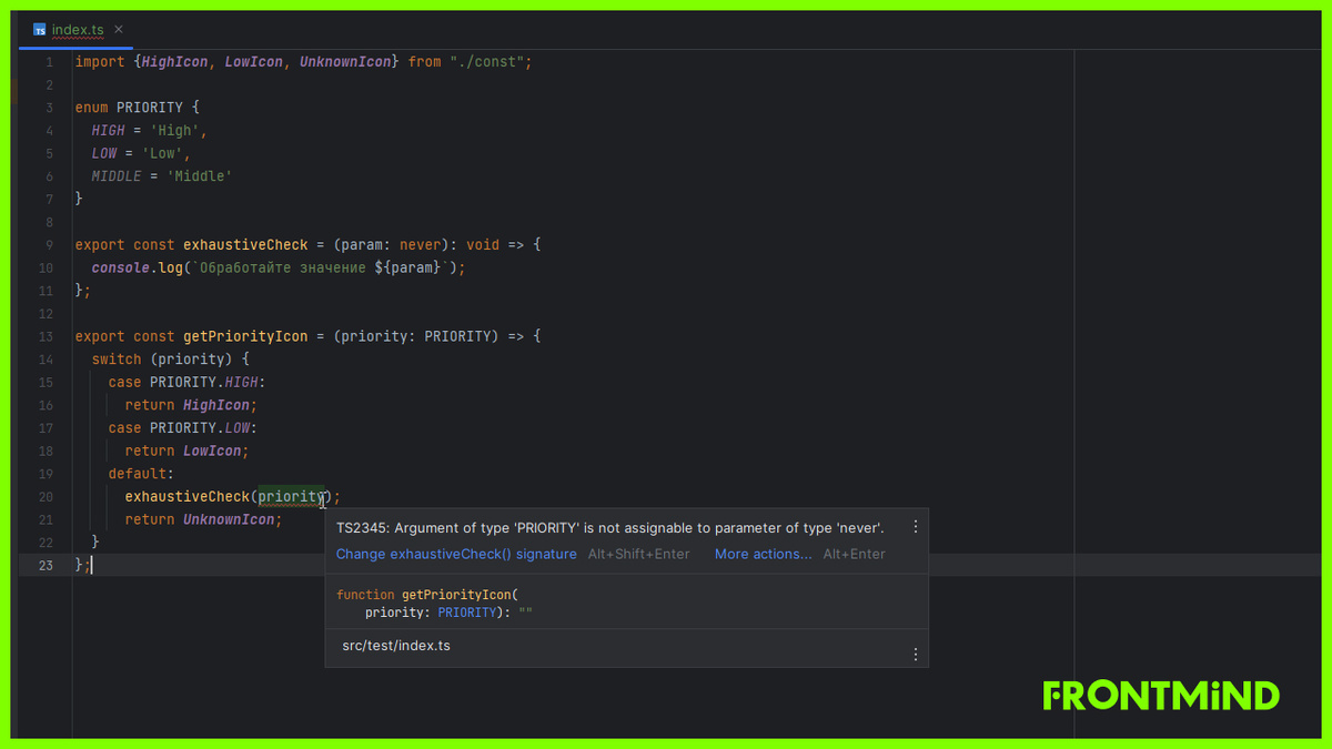 Наверное в каждом проекте есть несколько enum'ов, значения которых надо обработать по разному, например enum состояния - в зависимости от которого у нас может меняться отображение. В начале все идет хорошо, но через какое то время в эти enum'ы добавляются новые значения и вот тут возникают проблемы — легко упустить: поправить все switch и if условия, где они используются. Вроде мелочь, но сколько раз вы натыкались на ошибки, когда код просто не ожидал определённого значения? 🙈 Тогда я начал искать решение и наткнулся на крутой способ сделать код более защищённым с помощью TypeScript и типа never. Именно эта техника помогла мне избежать лишних багов и сделать код предсказуемым. Давайте разберёмся, как она работает! export const exhaustiveCheck = (param: never): void => { console.log(`Обработайте значение ${param}`); }; Здесь never служит маркером, который указывает, что функция exhaustiveCheck вообще не должна быть вызвана — ведь все случаи должны быть обработаны. А если этот случай вд