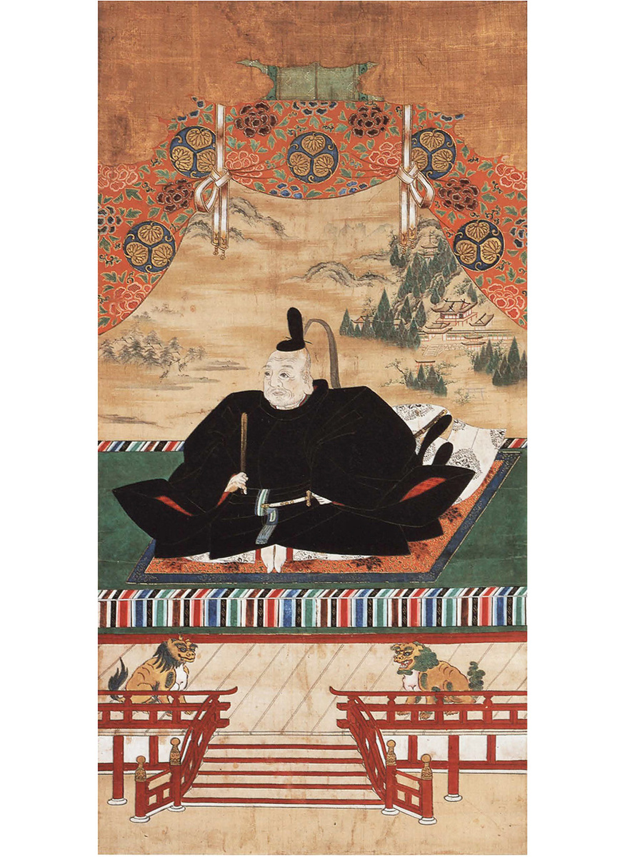 На первый взгляд вряд ли можно подумать, что этот величественный портрет изображает одного из самых проницательных и могущественных полководцев в истории Японии — Токугаву Иэясу (1543-1616), первого сёгуна раннего Нового времени. Великий военачальник изображен в традиционных придворных одеждах, а не в официальном самурайском костюме или доспехах. Да, в руках он держит церемониальный скипетр, традиционный для портретов воинов, но единственным указанием на его статус именно самурая является длинный меч, спрятанный за поясом его одежды. Такой портрет обычно заказывался исключительно для членов семьи, чтобы использовать его на поминальных службах по усопшему. Но Иэясу широко почитался как буддийско-синтоистское божество Тосё Дайгонген (Великое Воплощение, Озаряющее Восток), и его изображения были созданы в большом количестве на протяжении всего периода Эдо на основе портретов, сделанных сразу после его смерти в 1616 году. Алтарные занавеси и возвышенная платформа с красными колоннами и льв