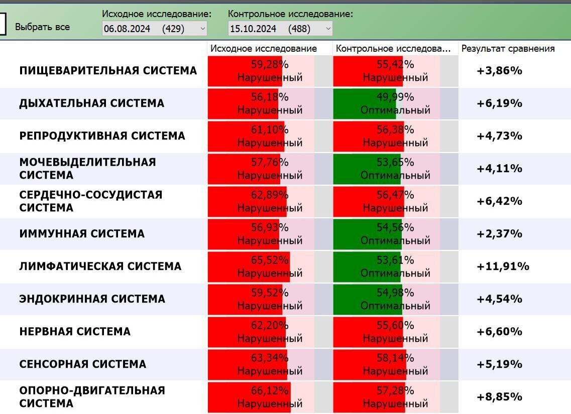 На диагностике выявили нарушения со стороны многих систем организма, в частности - опорно-двигательная, лимфатическая, сердечно-сосудистая (в целом застой жидкости в организме) и нервная; также паразитарная нагрузка и состояние выгорания.