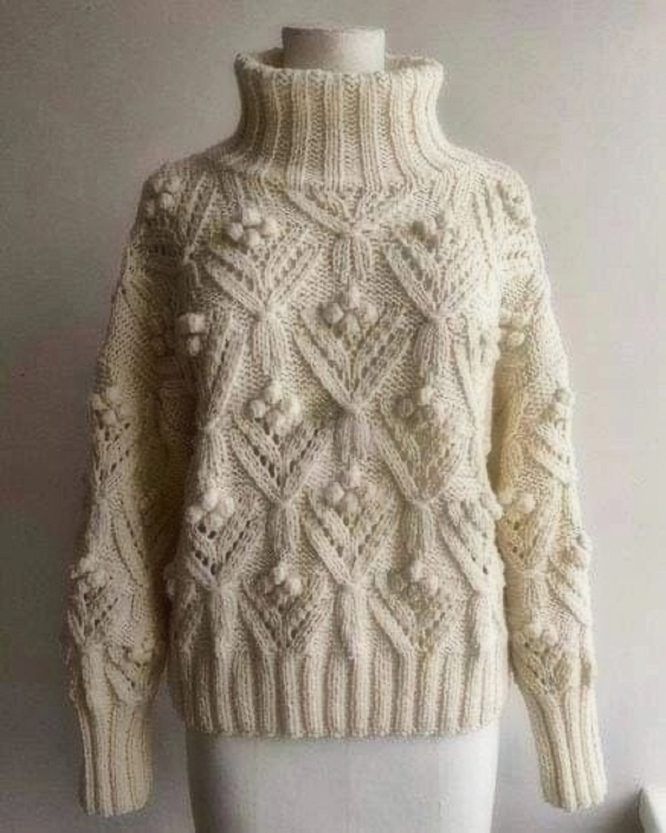 Уютный свитер оверсайз натурально-белого цвета, связанный оригинальным фантазийным узором из объёмных «букетиков». Знаю, что шишечки в узорах любят не все, но здесь они смотрятся очень гармонично и эффектно, согласитесь?!
