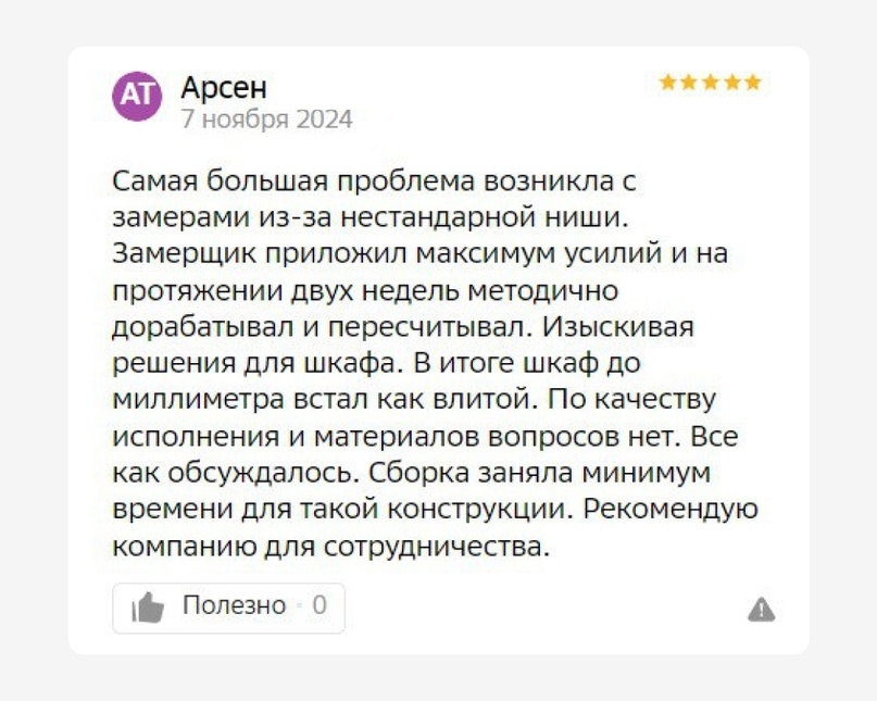 Когда шкаф был установлен, то он действительно «встал как влитой». Заказчик отметил, что сборка прошла быстро, а результат превзошел все первоначальные ожидания. Сами понимаете, тратить личное время на положительный отзыв готов не каждый, уж так заведено в нашем обществе.