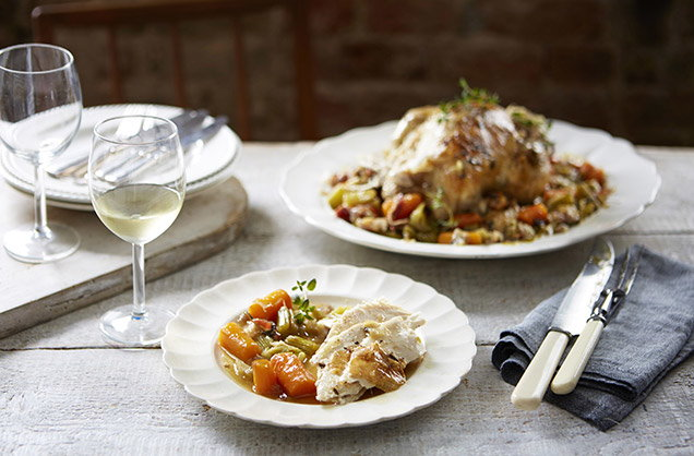 большая целая курица Разогрейте духовку до 170ºC, конвекция 150ºC. Нарежьте 4 моркови, 1 красную луковицу, 2 стебля сельдерея, 1 лук-порей и 4 ломтика копченного бекона крупными кусками. Разогрейте 1 ст. л. оливкового масла в большой жаропрочной кастрюле. Добавьте нарезанные овощи и бекон. Готовьте на сильном огне, пока овощи не начнут темнеть и размягчаться. Добавьте 4 очищен