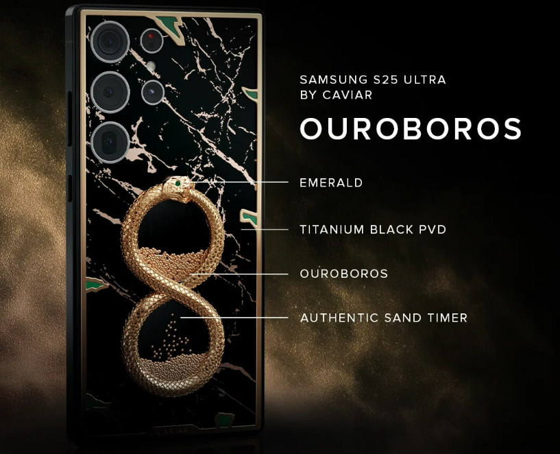 Люксовый бренд Caviar известный своими роскошными кастомизированными флагманскими смартфонами, представил свой очередной шедевр — коллекцию кастомных устройств Samsung Galaxy S25 Ultra, вдохновленных древним символом уробороса. Очередной выпуск посвящен году Змеи, сочетая глубокий философский символизм с передовыми технологиями и эксклюзивностью. Коллекция, названная «Лунный год», представляет дизайн, основанный на концепции змеи-уробороса, кусающей свой хвост, символизирующей бесконечность, обновление и единство начала и конца. Эта философская эмблема имеет особое значение в восточных традициях, где змея олицетворяет мудрость, возрождение и процветание. Флагманская модель коллекции, Samsung Galaxy S25 Ultra Ouroboros, является ярким примером этого сочетания искусства и технологий. Дизайн телефона включает в себя трехмерную фигурку уробороса из золота 999 пробы, обвивающего функциональные песочные часы, встроенные в корпус телефона. Песочные часы содержат золотые частицы, которые падаю
