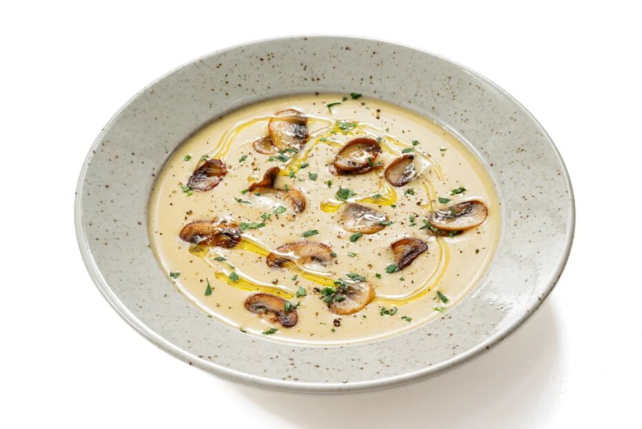 Замечательный рецепт, превращающий сырный суп — казалось бы, простую еду — в благородное и интересное блюдо. Причем грибов тут много: и сушеные белые, отвечающие за благородство и характер, и шампиньоны, дающие увесистость супу, и трюфельное масло, которое тут же переводит советскую бытовую классику в разряд серьезной гастрономии. Ингредиенты Сушеные белые грибы 40 г Картофель 700 г Вода 2 л Репчатый лук 1 головка Морковь 1 штука Растительное масло 60 мл Шампиньоны 200 г Сливочное масло 20 г Плавленый сыр 400 г Петрушка 5 г Трюфельное масло по вкусу Соль по вкусу Молотый черный перец по вкусу 1Подготовить все ингредиенты. Сушеные грибы промыть от песка холодной проточной водой. 2В кастрюлю влить воду и добавить сушеные грибы. Довести до кипения и варить 10 минут на небольшом огне. 3Очистить и нарезать картофель, добавить в кастрюлю с грибным бульоном и варить еще 10 минут или до готовности картофеля. Инструмент Нож картофельный 4.Лук нарезать мелкими кубиками. Морковь натереть на круп