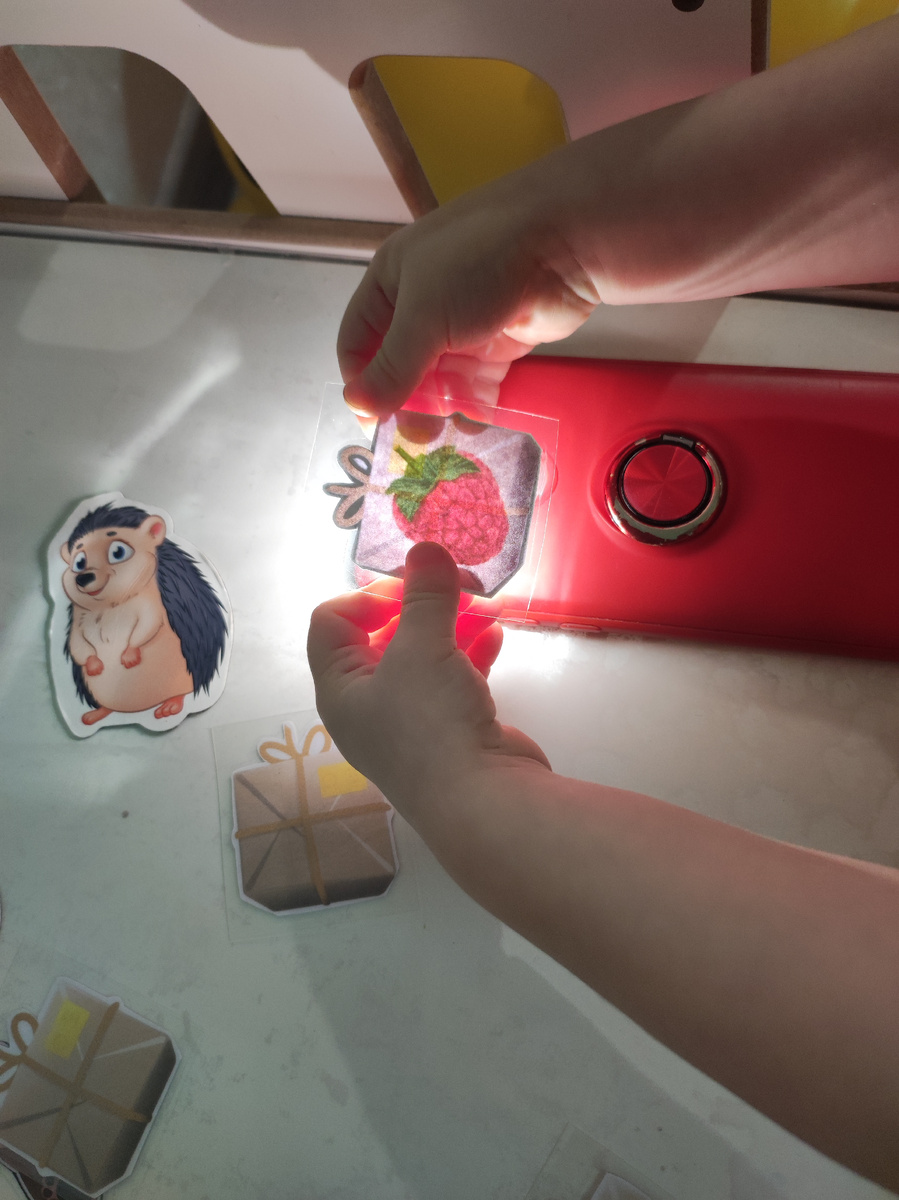 2. Сканирование: Ребёнок по очереди выбирает посылку и с помощью фонарика «сканирует» её, заглядывая внутрь. Так они смогут увидеть, что же находится в каждой посылке.