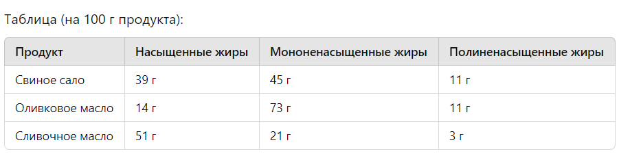 - Насыщенные жиры (сало): стабильны при высоких температурах, дают энергию и участвуют в синтезе гормонов.