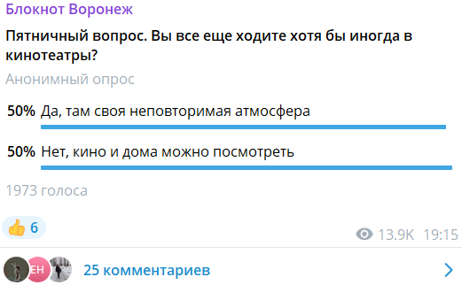 Стакан наполовину пуст. Редакция «Блокнот Воронеж» 24 января запустила пятничный опрос на тему походов в кинотеатры. Оказалось, что 50% из 1973 опрошенных читателей бросили посещать кинотеатры совсем. Среди причин люди в комментариях указывали следующее: «Сейчас не на что ходить, ничего стоящего не снимают» «Смотреть нечего, один позор» «Дети выросли, некого водить в кино» «Невозможно смотреть с их долби эраундом. Оглушительный звук» «Не хочется сидеть в жующе-пьюще-чавкающем зале» «С удовольствием бы сходила на хорошие фильмы, но теперь не на что» «С тех пор, как в кино стали продавать попкорн и газировку – больше туда не хожу» Однако половина респондентов продолжает иногда посещать кинозалы из-за особенной атмосферы во время сеансов. Аркадий Водкин