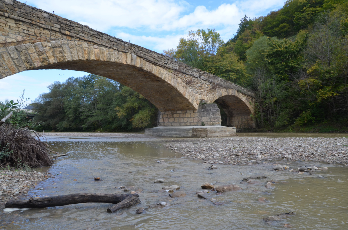 СТАРИННЫЙ КАМЕННЫЙ МОСТ через реку Дах построен казаками 2-го Урупского казачьего полка в 1906 году. Их прислали в Даховскую для работ после восстания 1905 года в Екатеринодаре. В состав полка входила большая часть жителей станиц Майкопского района. Для придания каменному мосту особой прочности в известково-молочный раствор, скрепляющий камни, добавляли белок куриных яиц, которые собирали со всей станицы. Поэтому второе название конструкции, известное среди местного населения, - Яичный мост. В строительстве моста большую помощь казакам оказывали местная церковь и станичники. Мост хорошо сохранился до наших дней, он построен из жёлтого песчанника и похож на виадук, который стоит на двух широких сваях и имеет два арочных пролёта. Мост, словно страж времени, бережно хранит в себе историю прошлого. Его жёлтый песчаник, под воздействием солнца и ветра, приобрёл приятный золотистый оттенок, усиливая его величественный вид. Под мостом протекает река, чьи воды отражают лучи света, придавая о