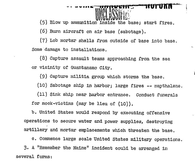 ЦРУ рассекретило план терактов против американцев для оправдания войны с Кубой - власти США планировали массовые убийства своих граждан: -План операции «Нортвудс» разрабатывался в 1962 году Объединённым комитетом начальников штабов США. Его целью было получить непосредственный повод для военного вторжения США на Кубу. -Для этого планировалась классическая операция под чужим флагом — американские спецслужбы должны были совершить против американских же граждан многочисленные теракты, а затем обвинить в них Кубу. В план входили: 1. Подрыв корабля в Гуантанамо: повторение инцидента, который привёл к войне США с Испанией в 1898 году; 2. Террористическая кампания в Майами и других городах Флориды, в рамках которой предполагалось взрывать бомбы в общественных местах и атаковать беженцев с Кубы; 3. Сбитие гражданского самолёта с максимально агрессивным освещением в СМИ и раздуванием конфликта; 4. Диверсия на собственной военной базе, которая находилась рядом с Кубой. Джон Кеннеди категорическ