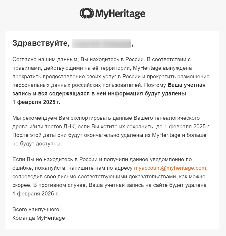 "Согласно нашим данным, Вы находитесь в России. В соответствии с правилами, действующими на её территории, MyHeritage вынуждена прекратить предоставление своих услуг в России и прекратить размещение персональных данных российских пользователей. Поэтому Ваша учетная запись и вся содержащаяся в ней информация будут удалены 1 февраля 2025 г."