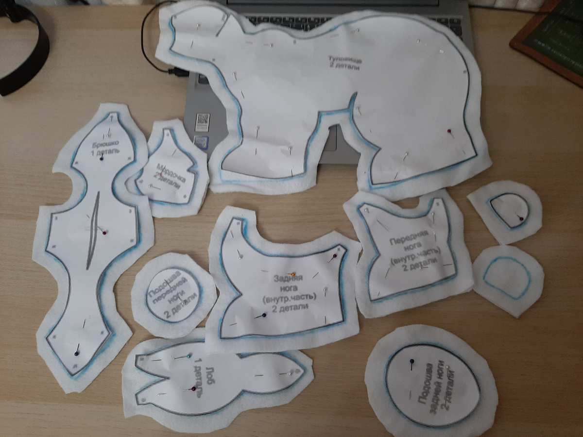 Итак, скачав и распечатав на бумаге формата А2 (раньше я делала олененка и крысу поменьше, но медведя захотела крупного, чтобы чуть ли не елку держал), нанесла на ткань детали и вырезала с припусками на швы.