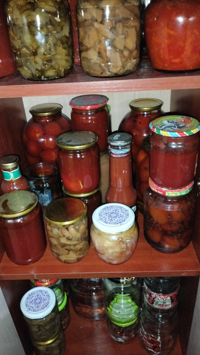 Ууу... Обычно все сразу запасы мяса и бакалеи бегут считать, а я решила посмотреть сколько же у меня... Банок. Тех самых, с заготовками на зиму, со всякими помидорками, огурчиками и салатиками. Угу. Года два не считала, а то и больше. Просто примерно знаю, что закончилось, а чего можно вообще больше никогда в жизни не делать. Проблема для меня в том, что все банки заныканы по разным углам: часть в шкафу на лестничной площадке (у нас у всех соседей на площадке по шкафчику), часть в шкафу в квартире, часть на балконе и немного в холодильнике. Сразу предупрежу, из прошлогоднего (или это уже позапрошлогоднее?! Ну, в общем лета 2023) только варенье, фрукты в сиропе, грибы и несколько банок с томатным соком и соусом. И при этом я открываю свеженькое... Потому что оно ближе стоит ((( Ну, что?! Готовы ужасаться?! Сначала про то, чего меньше всего. Компот. На момент подсчёта было 2 банки по 3 литра абрикосового. Одна тут же была открыта и наполовину выпита. Так что в список вносим только одн