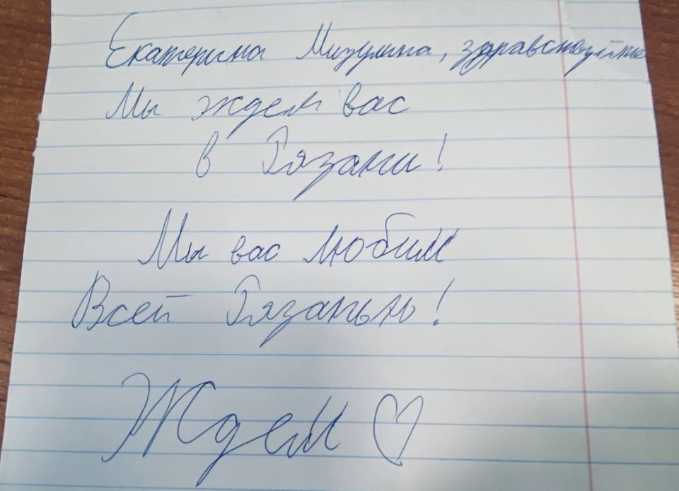 Екатерина Мизулина в своём telegram-канале опубликовала записку от школьника из Рязани. На листке бумаги автор признался главе Лиги безопасного интернета в любви от лица всего города. — Екатерина Мизулина, здравствуйте! Мы ждём вас в Рязани! Мы вас любим всей Рязанью! Ждём! – говорится в письме. Напомним, встреча школьников и студентов с Екатериной Мизулиной состоится в рязанской филармонии 28 января в 14 часов (0+). О формате и тайминге встречи можно узнать здесь. Также в своём канале Екатерина Мизулина опубликовала ответы на самые распространённые вопросы по предстоящей встрече. Вопрос: Могут ли учащиеся колледжей и студенты ВУЗов придти на встречу?
