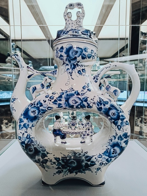 В экспозиции представлена история развития промысла – от 5-цветной майолики 18 века до современного фарфора, выдержанного в классической сине-белой гамме.