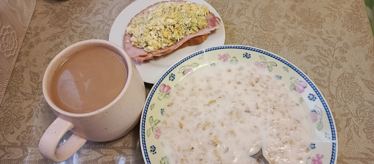 На завтрак овсяная каша и хлеб с ветчиной, яйцом и авокадо, кофе с молоком