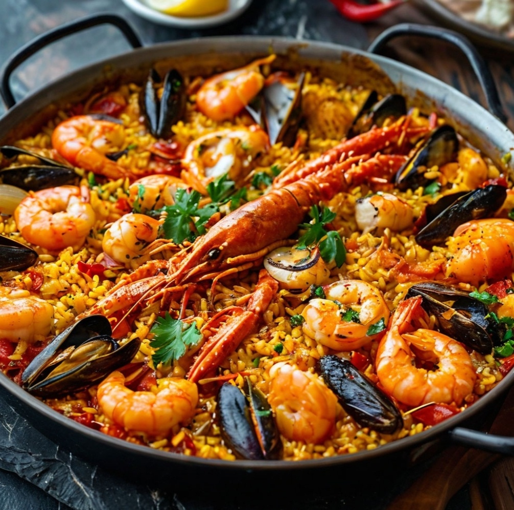 Ингредиенты: 300 г риса для паэльи; 200 г креветок; 150 г кальмаров; 100 г мидий; 50 г зелёного горошка (замороженного или свежего); 1 морковь; 1 луковица; 1 сладкий перец; 3 зубчика чеснока; 3 столовые ложки оливкового масла; 1 литр рыбного или овощного бульона; 1 чайная ложка паприки; *соль и перец по вкусу.**Приготовление:**1. Очистите и нарежьте лук, морковь и сладкий перец кубиками. 2. Разогрейте оливковое масло в глубокой сковороде или казане. Обжарьте лук и чеснок до прозрачности. 3. Добавьте морковь и перец, продолжайте обжаривать ещё несколько минут. 4. Добавьте морепродукты (креветки, кальмары, мидии) и зелёный горошек, обжарьте всё вместе ещё 2-3 минуты. 5. Промойте рис и добавьте его к овощам и морепродуктам. 6. Залейте всё бульоном, добавьте паприку, соль и перец по вкусу. Перемешайте. 7. Доведите до кипения, затем уменьшите огонь и тушите под крышкой на медленном огне около 20 минут, пока рис не будет готов.Полезность: Паэлья с морепродуктами — это не только вкусное, но и