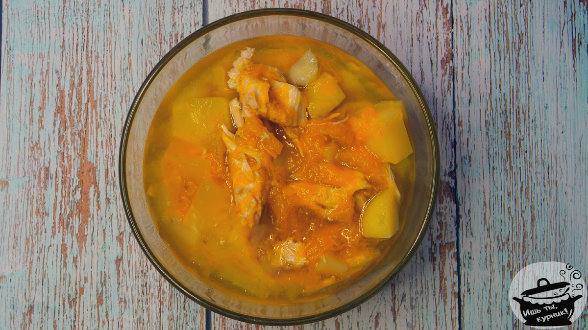Ингредиенты: · куриное бедро без кожи – 2 шт.; · кабачок – 300 гр.; · тыква – 300 гр.; · картофель – 250 гр.; · лавровый лист – 1 шт.; · чёрный перец горошком – 4 шт.; · соль по вкусу. Приготовление: Кабачок, тыкву и картофель порезать одинаковыми кубиками. Вскипятить воду с перцем и лавровым листом, посолить, добавить курицу, отварить до готовности. Снять мясо с кости, вернуть в бульон, удалить перец и лавр. Добавить овощи, дать закипеть, варить 15-20 минут до готовности овощей. Приятного аппетита!