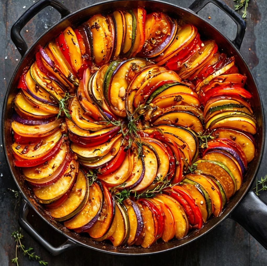 Приготовление: Ингредиенты: Баклажаны — 2 шт. Кабачки — 2 шт. *Помидоры — 4 шт.*Лук — 1 шт.*Чеснок — 2 зубчика.*Оливковое масло — 3 ст. л.*Базилик — по вкусу.*Соль, перец, сахар — по вкусу. Полезность: Рататуй — это не только вкусное, но и полезное блюдо. Овощи, которые используются в рататуе, богаты витаминами, минералами и антиоксидантами, которые необходимы для здоровья. Баклажаны содержат клетчатку, которая улучшает пищеварение, и калий, который полезен для сердца. Кабачки богаты витамином С, который укрепляет иммунную систему, и фолиевой кислотой, которая необходима для здоровья нервной системы. Помидоры содержат ликопин, который является мощным антиоксидантом и может помочь снизить риск развития некоторых видов рака. Лук и чеснок обладают антибактериальными и противовоспалительными свойствами, которые могут помочь укрепить иммунную систему. Оливковое масло, которое используется для приготовления рататуя, богато мононенасыщенными жирами, которые полезны для сердечно-сосудистой сис