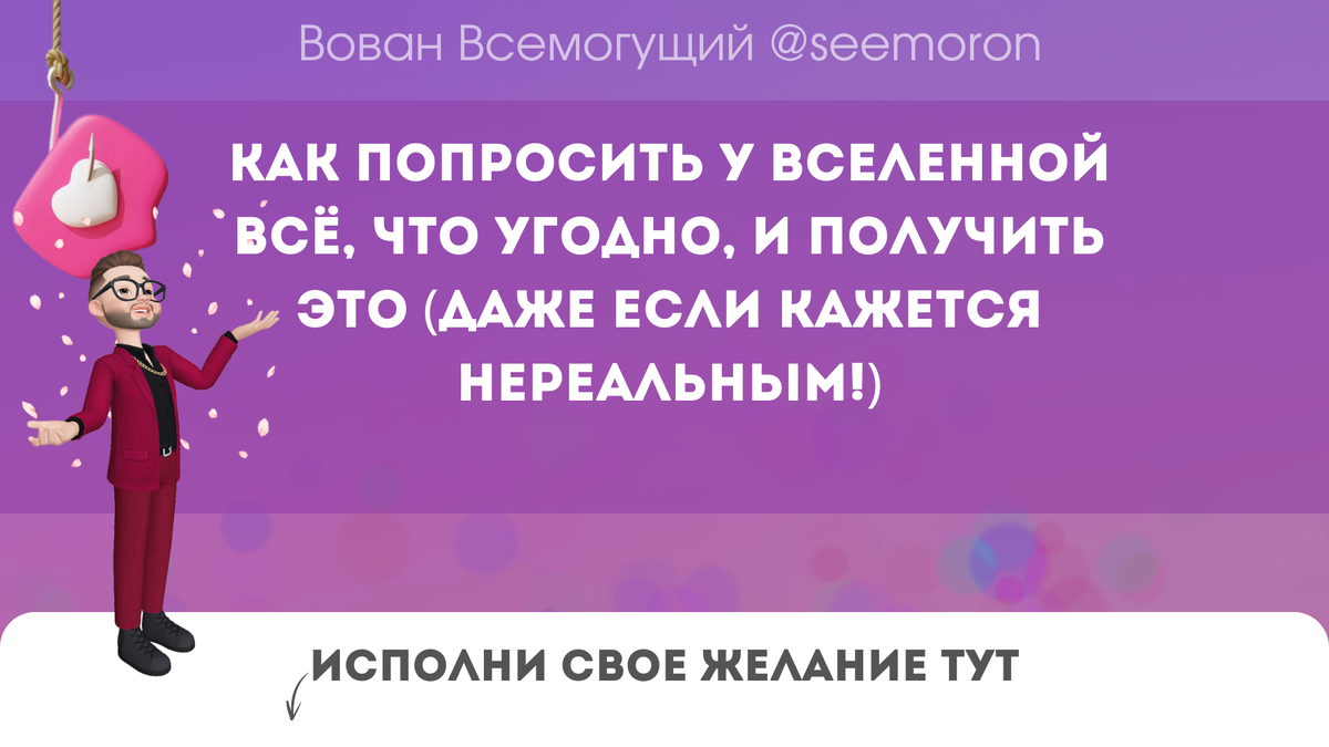Привет, феюшки и волшебницы С вами Вован Всемогущий, тот самый, кто из 90-х пришёл с разборок, а остался с вами, чтобы исполнять желания. Сегодня расскажу про ритуал, который работает даже тогда, когда кажется, что шансов ноль. Я называю его «Приму в дар от Вселенной», потому что он прощупывает магические вибрации нашего мира и, хоп, — подкидывает вам подарочек! Ну, погнали! Берём лист бумаги (можно цветной — я люблю зелёный, денежный такой). Сверху пишем волшебную фразу: «Приму в дар от Вселенной...» И вот тут, дорогие мои, включаем всю вашу фантазию. Никакого «ой, это невозможно». Вспоминаем свои самые дикие мечты и пишем их так, как будто они уже скоро на подходе. «Приму в дар от Вселенной поездку на Мальдивы, чтобы валяться в гамаке с кокосом в руках!» «Приму в дар от Вселенной повышение — пусть я буду начальником всех начальников!» «Приму в дар от Вселенной новенький автомобиль (красный, чтоб сразу выделяться!)» «Всё, что происходит или произойдёт в моей жизни, пусть будет в луч