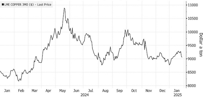 Цены на медь немного снизились после заявления президента США Дональда Трампа о планах ввести импортные пошлины на этот металл, а также на алюминий и сталь. Новая угроза торговых войн ударила по сырьевому рынку и укрепила доллар Цены на медь на Лондонской бирже металлов. Источник: Bloomberg Трамп пригрозил ввести пошлины на компьютерные чипы и фармацевтическую продукцию в попытке стимулировать внутреннее производство. Редакция Financial Times сообщает, что министр финансов Скотт Бессент выступает за введение универсальных пошлин на импорт США начиная с 2,5% с постепенным увеличением. Трамп позже заявил, что хочет ввести более высокие пошлины, чем предлагается. Любые импортные пошлины на металлы, скорее всего, сильнее всего ударят по Канаде. По данным Morgan Stanley, в 2023 году на северного соседа США приходилось чуть более половины импорта алюминия по стоимости. Канада занимала второе место после Чили, как источник меди и была крупнейшим поставщиком стали в США, опережая Мексику и Южн