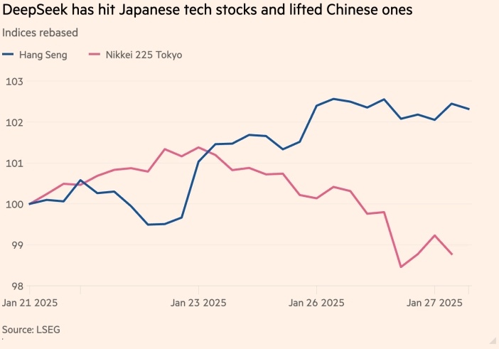 Вчерашнее падение акций Nvidia усилило понижательное давление В Японии во вторник продолжилось падение фондовых рынков. Акции технологических компаний продолжают активно продаваться, и это уже второй день подряд. Причиной этому стало резкое падение акций компании Nvidia, занимающейся производством чипов. В понедельник акции Nvidia потеряли 589 миллиардов долларов своей стоимости, что стало историческим падением. Уолл-стрит и Кремниевая долина были охвачены паникой из-за угрозы, которую представляет для США китайский стартап DeepSeek. Это может привести к потере лидерства в сфере искусственного интеллекта и необходимости инвестировать сотни миллиардов долларов в базовую инфраструктуру. Японский технологический индекс Nikkei 225 упал на 1,7% в Токио утром во вторник. Однако затем он восстановился до снижения на 1,1%. Более широкий индекс Topix, который имеет меньший вес для японских технологических компаний-экспортёров, вырос на 0,2%. В Гонконге акции китайских технологических компаний в