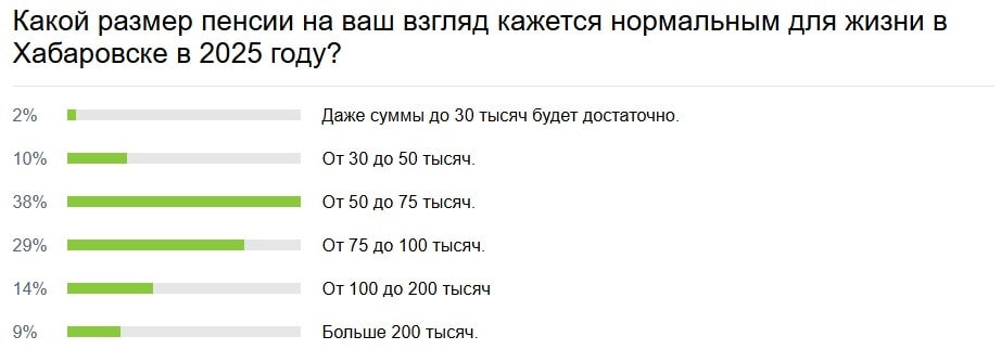 Мы решили поинтересоваться у горожан, какая пенсия, по их мнению, будет идеальной для жизни в Хабаровске в 2025 году. 38% заявили, что оптимальный вариант - от 50 до 75 тысяч. 29% считают, что государство должно выделять от 75 до 100 тысяч рублей, 14% - от 100 до 200 тысяч. 10% хватит суммы от 30 до 50 тысяч, а 9% необходимо более 200 тысяч рублей. И лишь 2% будет достаточно менее 30 тысяч. Отметим, что на главной странице DVHAB.ru каждую неделю проводятся опросы на самые актуальные и острые темы. Найти вы их можете, пройдя по ссылке. Напомним, что ранее мы выяснили в результате опроса, что безналичный расчет бумажным деньгам предпочитают хабаровчане. У 39% опрошенных наличные деньги появляются достаточно редко, 35% же держат на руках небольшую сумму - просто на всякий случай.