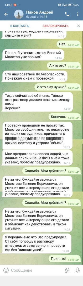 Аферисты создали фейковый аккаунт от имени главы правительства Кузбасса Андрея Панова. Об этом он сообщил в своем Telegram-канале. Андрей Панов опубликовал скриншоты переписки, которая якобы велась от его имени. В сообщениях мошенник сообщает о проверке, проведенной службой безопасности, и предупреждает о предстоящем звонке специалиста, который расскажет, как действовать дальше. Глава правительства Кемеровской области сообщил, что не имеет никакого отношения к этим сообщениям. Это всё проделки аферистов. «Снова создали поддельный аккаунт от моего имени. Ничего нового не пишут, всё те же схемы», — пишет в своём Telegram-канале Андрей Панов.